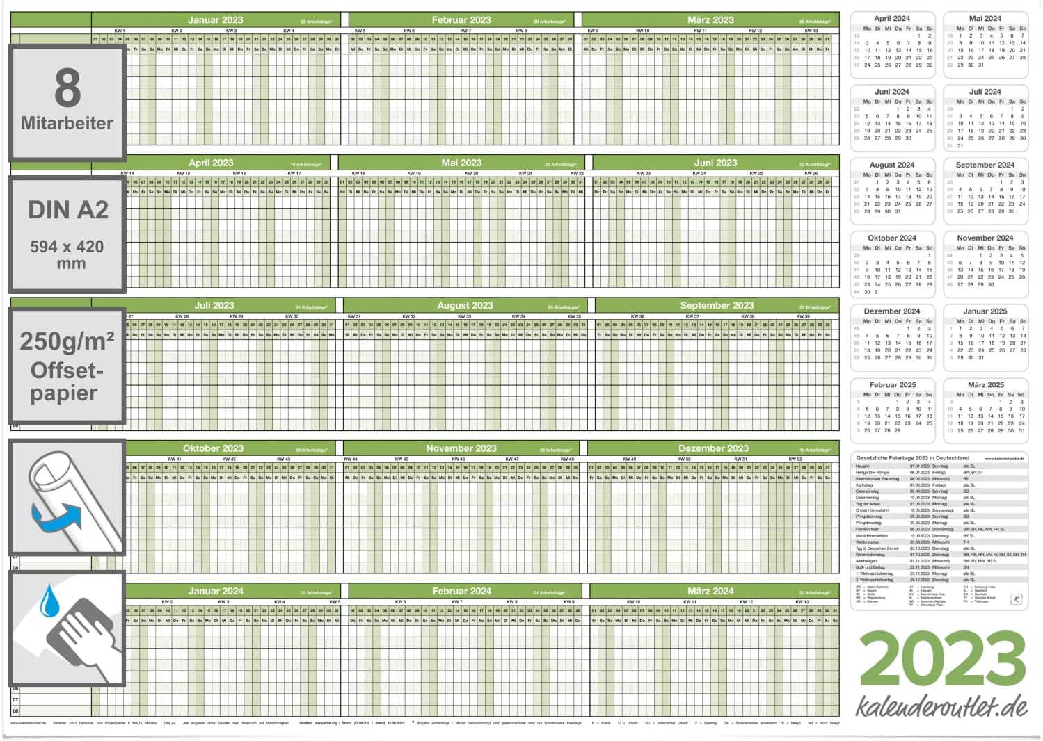 Personalplaner Urlaubsplaner 2023/24 feucht abwischbar DIN A2 59,4 x 42,0 CM für bis zu 8 Mitarbeiter grün GEROLLT