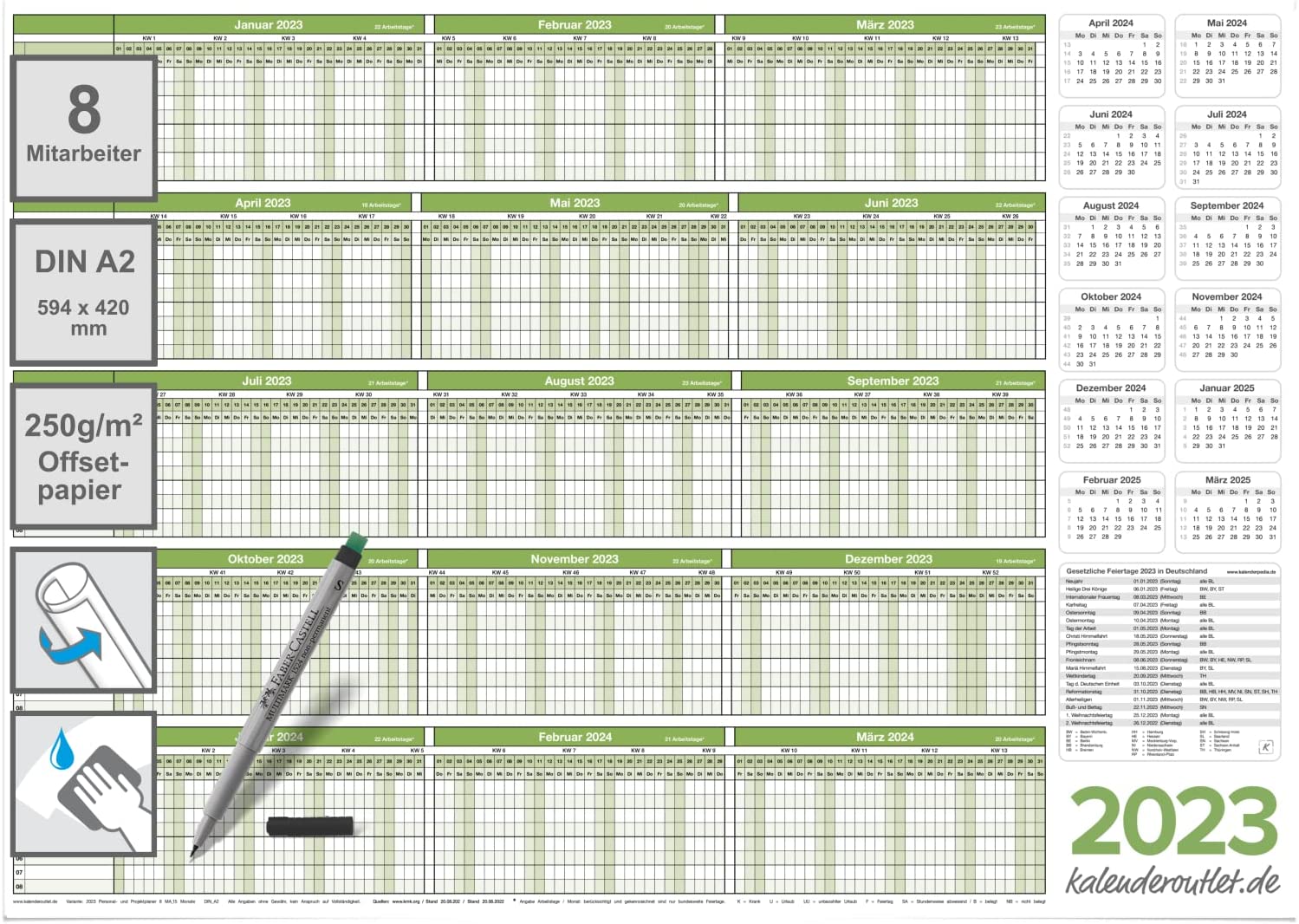 Personalplaner Urlaubsplaner 2023/24 Planer ist feucht abwischbar DIN A2 59,4 x 42,0 CM für bis zu 8 Mitarbeiter mit 1 non-permanent Marker GEROLLT