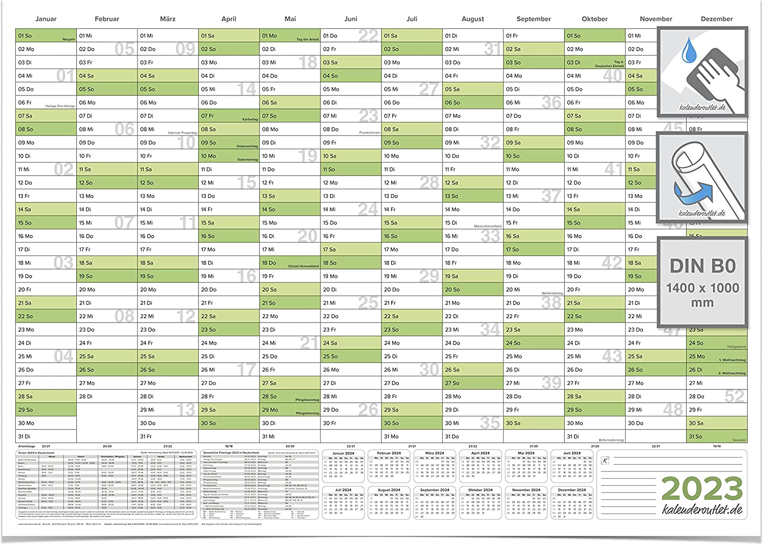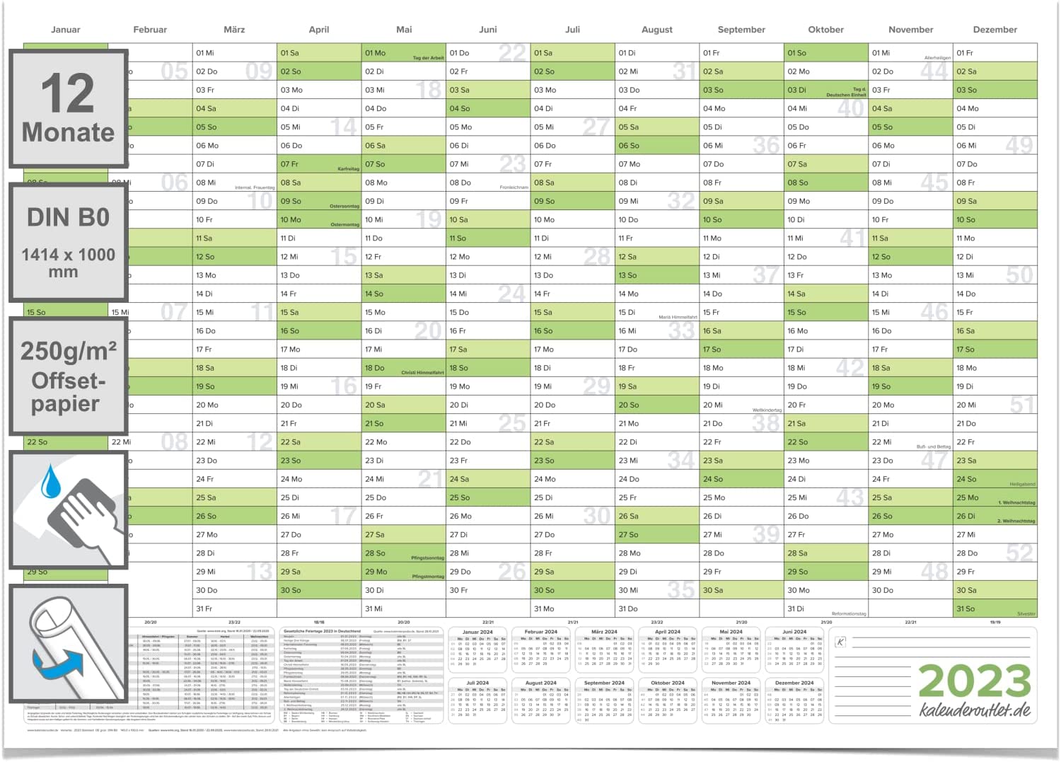 XXXL Jahresplaner Wandkalender 2023 grün extra groß, premium Qualitäts Papier 140x100cm DIN B0, gerollter Wandplaner, Jahreskalender, Kalender 2023 in deutscher Sprache von Kalenderoutlet