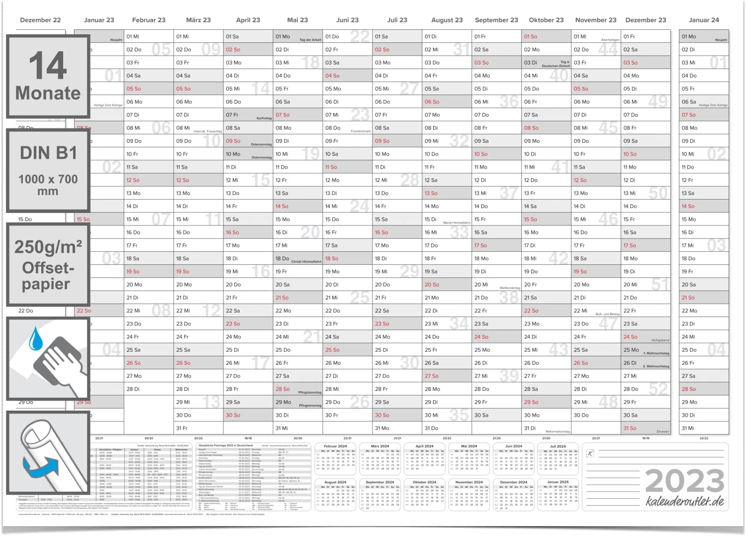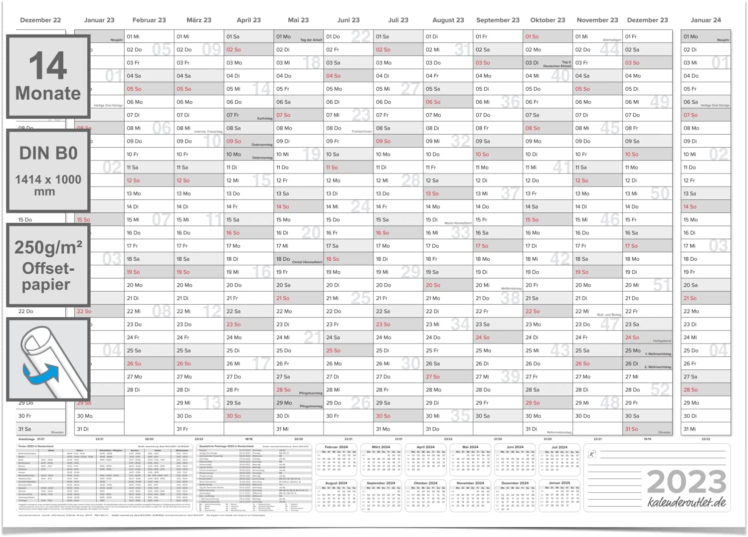 XXXL Jahresplaner Wandkalender 2023 14 Monate Übersicht grau 140x100cm DIN B0 Wandplaner 2023, Jahreskalender ist gerollt als Poster - deutsche Sprache -