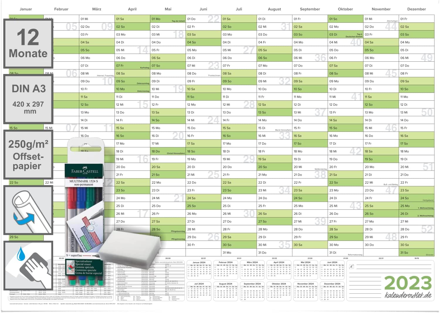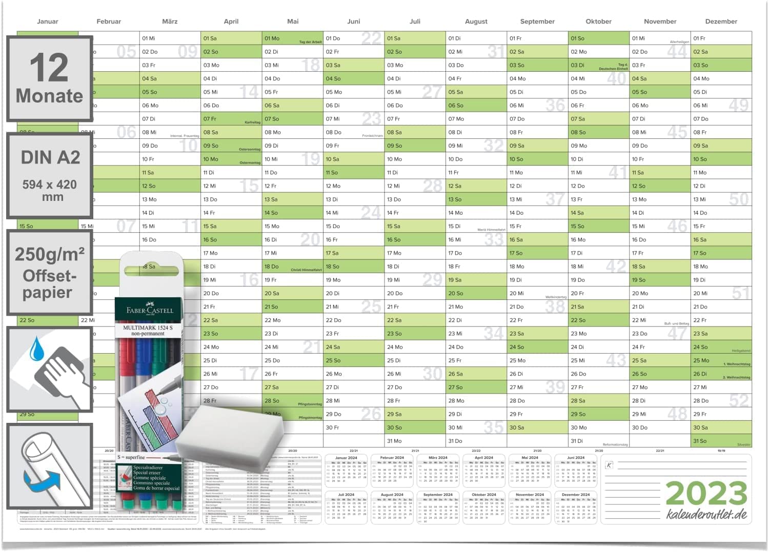 Abwischbarer XXXL Jahresplaner Wandkalender 2023 grün. Wandplaner gerollt 140x100cm gross DIN B0 inklusive 4er Stifte-Set. Jahreskalender 2023, Kalender - deutsche Sprache - von Kalenderoutlet