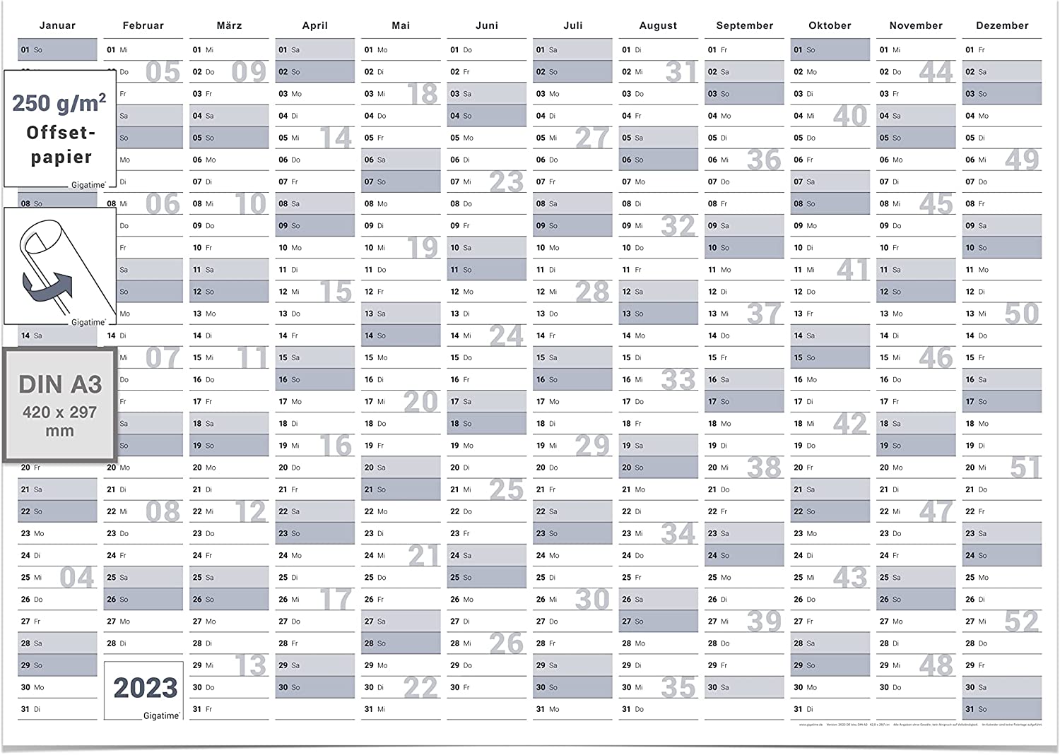 Gigatime Wandkalender Jahresplaner 2023 Format: DIN A3 42,0 x 29,7 cm blaugrau premium Qualität - deutsch