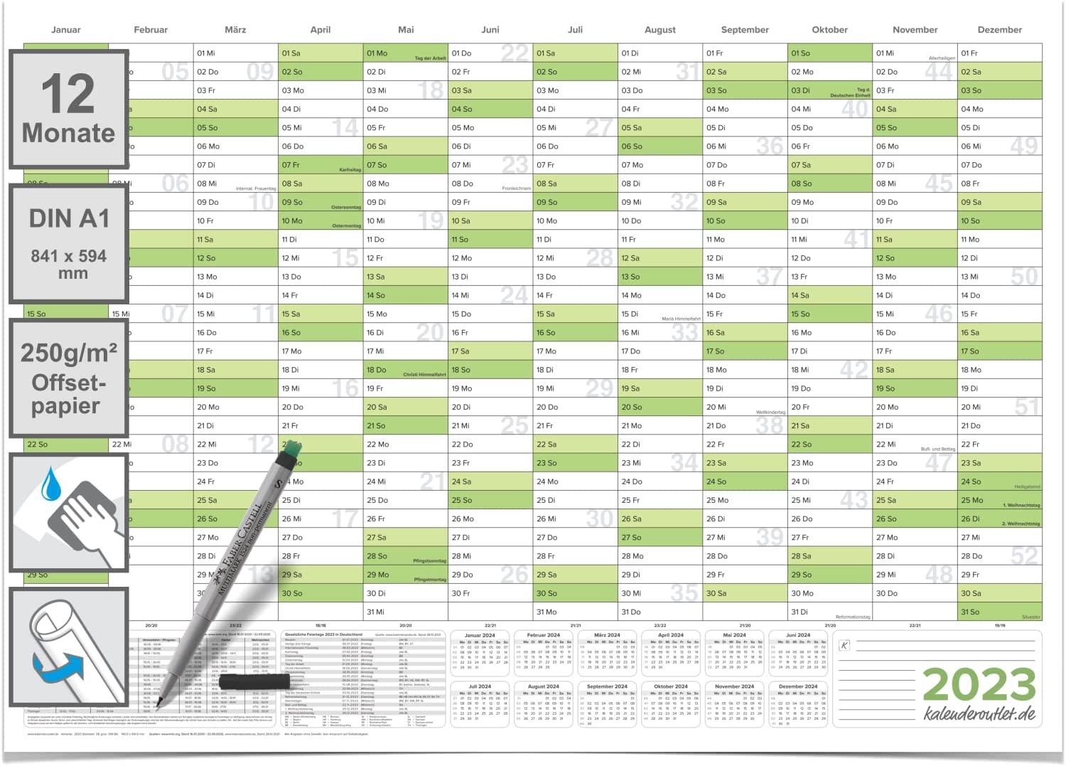 XL Jahresplaner Wandkalender 2023 grün, premium Qualitäts Papier 84,0x59,0cm DIN A1 gerollter Wandplaner 2023, Jahreskalender, Kalender in deutscher Sprache von Kalenderoutlet