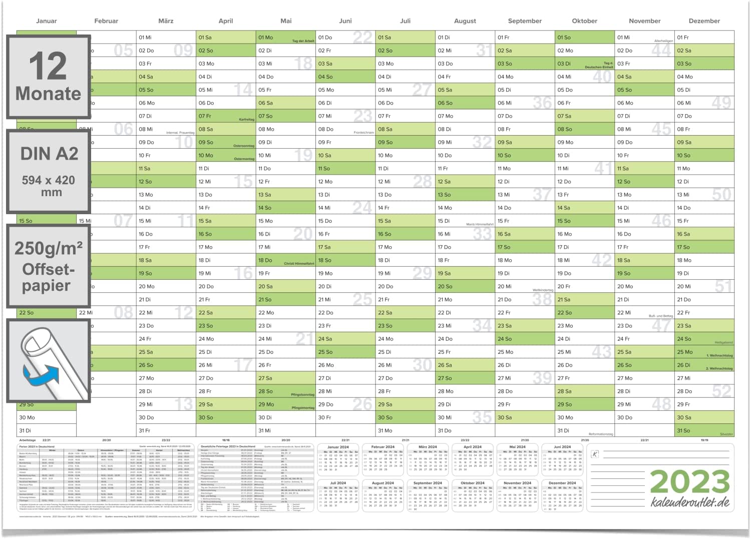 Jahresplaner Wandkalender 2023 Jahreskalender grün premium Qualität Format: 59,4 x 42,0 cm – DIN A2 - gerollt - Wandplaner, Jahreskalender, Kalender 2023, - deutsche Sprache -