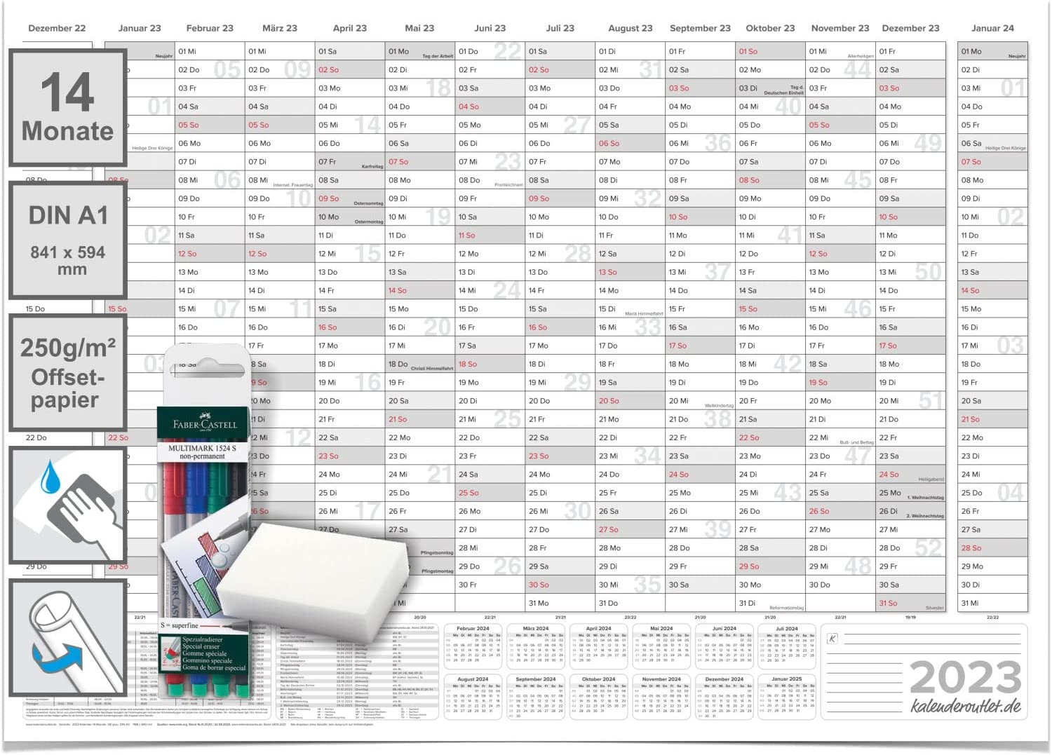 Abwischbarer XL Jahresplaner Wandkalender 2023 14 Monate feucht abwischbar grau 84,0x59,0cm groß DIN A1 inklusive Marker. Kalender Wandplaner 2023 Jahreskalender gerollt. - Deutsche Sprache
